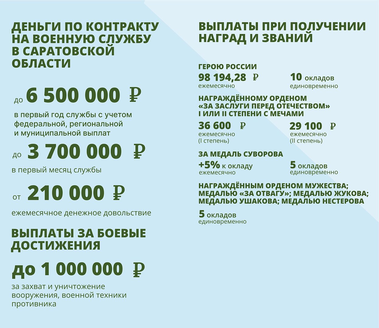 Таким образом, с учетом всех выплат саратовские контрактники могут получить уже в первый месяц службы до 3,7 млн рублей. За первый год службы - до 6,5 млн рублей.