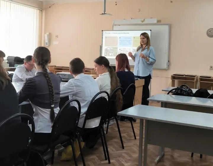 Ольга Николаевна Щукина, учитель географии филиала МОУ Романовская СОШ имени И.В. Серещенко в с. Мордовский Карай, представила занятие в 7 классе на тему: «Народов много – страна одна». Семиклассники приветствовали друг друга на языках народов России, знакомились с традициями народов, населяющих нашу Родину, и в конце занятия с удовольствием полакомились традиционным русским блюдом – блинами.