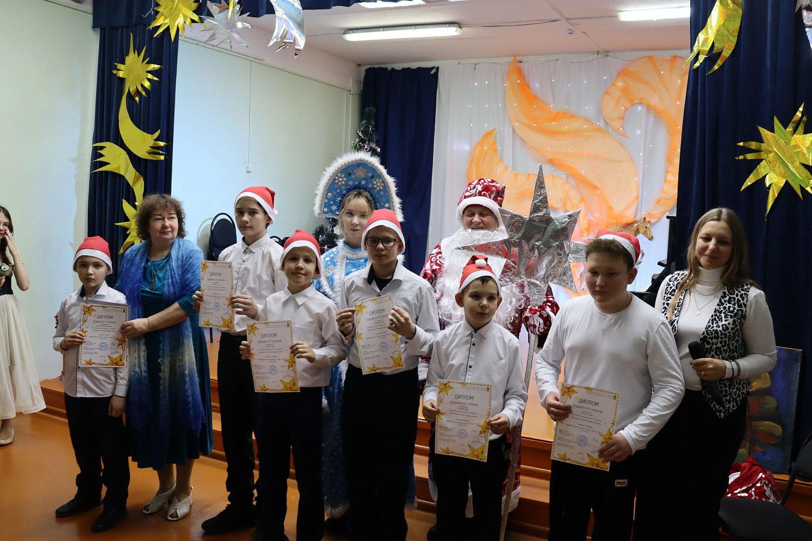 Ребята, участвовавшие и достигшие хороших результатов в конкурсах различного уровня, получили из рук директора дипломы победителей, а от Деда Мороза и Снегурочки все участники концерта получили сладкие подарки.