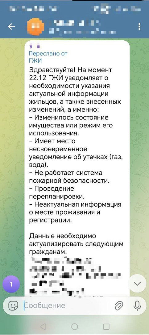 Уважаемые жители региона! Обращаем ваше внимание на то, что вновь участились случаи обращения мошенников от лица Госжилинспекции (ГЖИ) в личных сообщениях и домовых чатах в мессенджере Telegram.