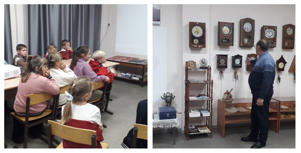 Занятие началось с просмотра фильма «Время и Часы». Экскурсовод школьного музея Анастасия Невзорова (кружок «Юные экскурсоводы») рассказала об истории, различных механизмах и разнообразии стилей часов. С интересом ребята рассматривали раздел «Часы бывают разные», где познакомились с различными механическими настенными часами. Живой интерес вызвали часы с кукушкой и часы с боем.