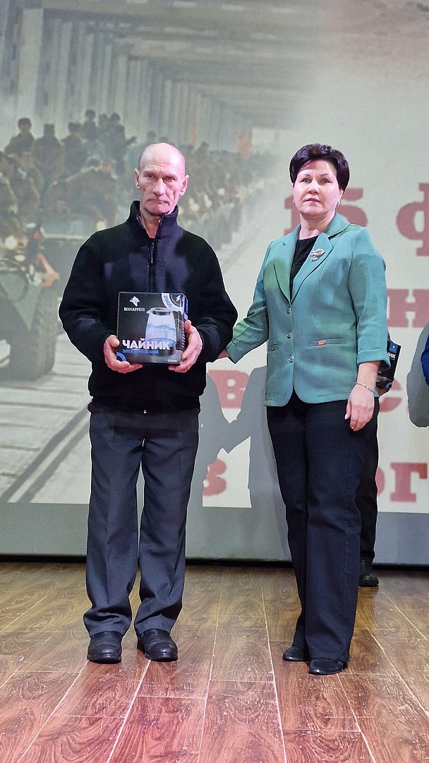 Ветераны под аплодисменты поднимаются на сцену, от администрации района им вручаются памятные подарки. В числе награжденных в этот день и сестра Владимира Алексеевича Синдеева из с. Подгорное, погибшего при исполнении интернационального долга. Минутой молчания присутствующие почтили память всех, кто погиб в войнах и конфликтах.