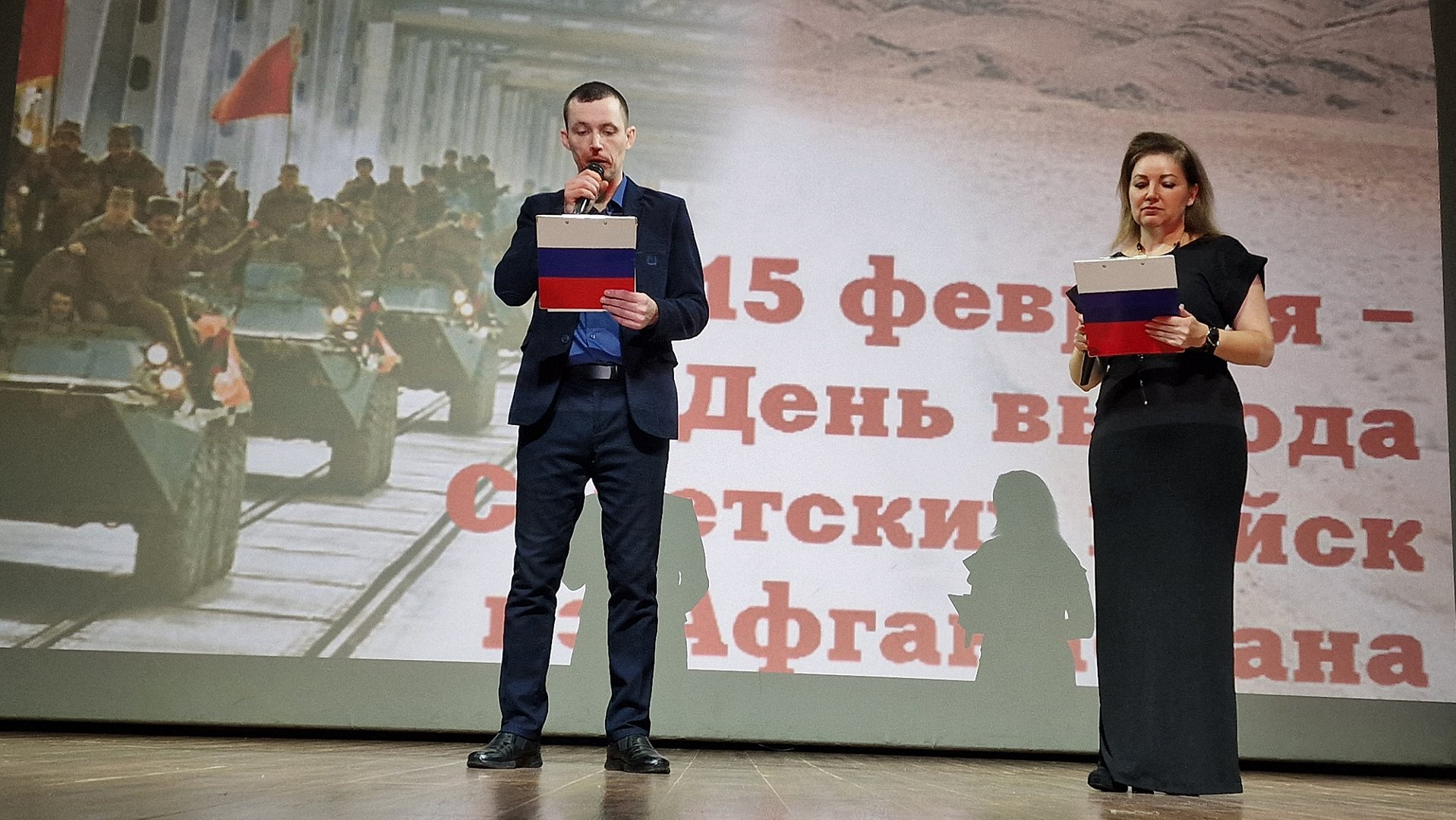 Ведущие Н. Кондратьева и В. Арюшин напомнили об истории этого дня, о том, как 9 лет и 51 день исполняли интернациональный долг простые советские парни. Для всех присутствующих показываются ролики, напоминающие ход вооруженного конфликта в Афганистане. Дата вывода советских войск стала днем памяти всех солдат, которые принимали участие в урегулировании конфликтов на территориях ближнего и дальнего зарубежья: Сирия, Чили, Испания, Куба и другие.