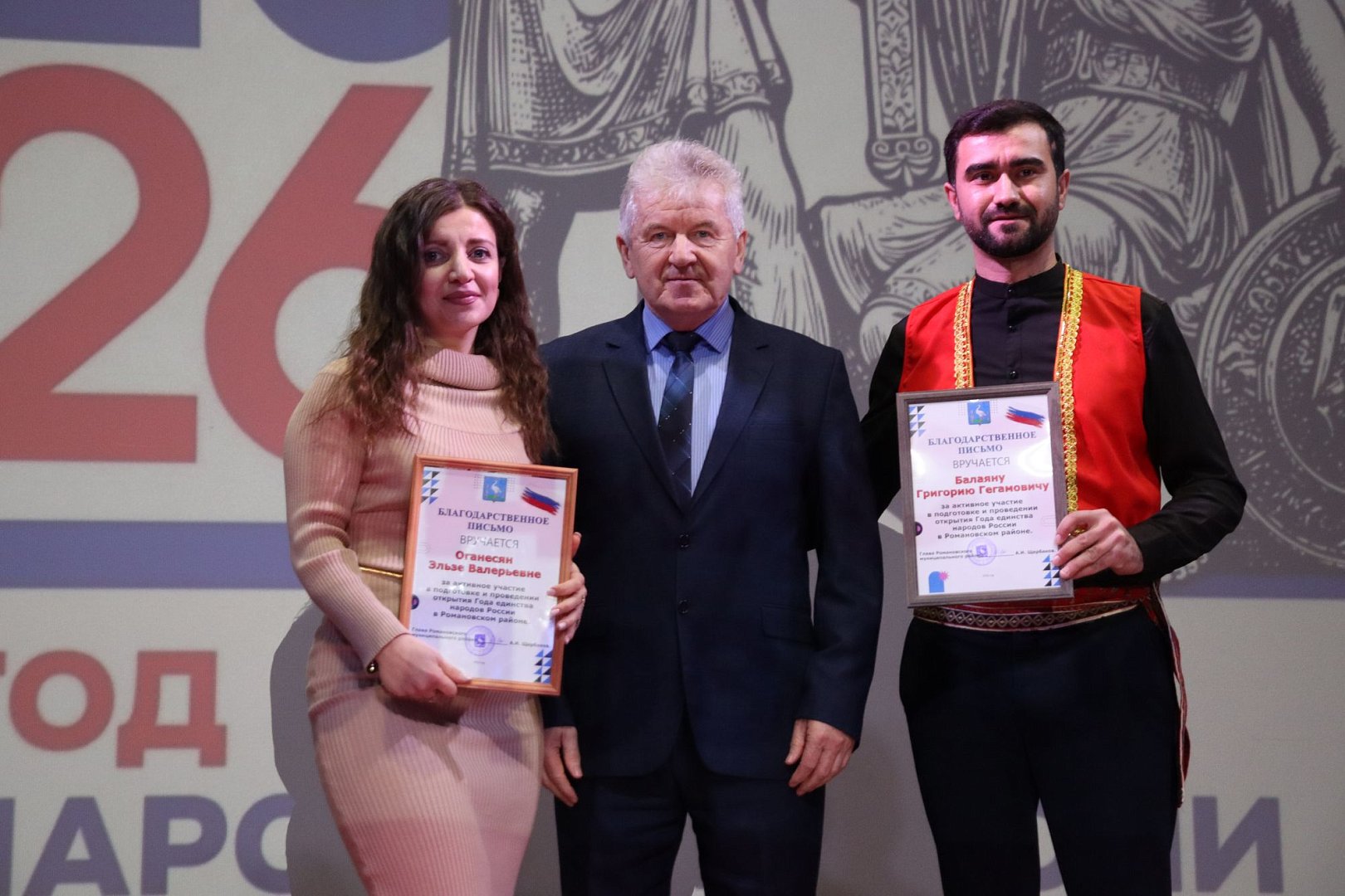 Глава района вручил благодарственные письма «за активное участие в подготовке и проведении открытия Года единства» жителям поселка Г.Г. Балаяну и Э.В. Оганесян. Силами их зрителям был представлен новый детский ансамбль с армянским танцем «Акчари», вызвавший восторг и хорошее настроение у зрителей.